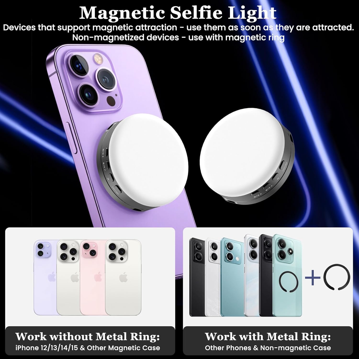 MAGNETIC CLICK-&-GO DESIGN – Instantly attach to any magnetic surface with 4 built-in super-strong neodymium rings! Perfectly compatible with all magnetic devices (iPhone 12-16 series, iPads, laptops, etc.). No clamps, no adhesives – just snap it on and shine anywhere. Your ultimate go-anywhere lighting solution.