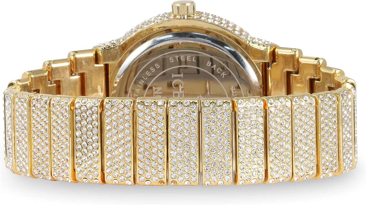 Striking Iced-Out Design – A 46mm timepiece featuring a fully blinged-out dial, black hands, and a 4-row iced bezel for a standout look.Brilliant Shine – Crafted with high-quality simulated diamonds that catch the light, creating an eye-catching effect.Custom Fit & Comfort – Includes an 8.5-inch metal link band with a link removal tool for easy, hassle-free adjustments.Precision & Durability – Powered by quartz movement, featuring an analog display and a stainless steel back cover for long-lasting performance.Luxury Statement Piece – Designed for those who love to stand out, this iced-out watch adds effortless style to any outfit.