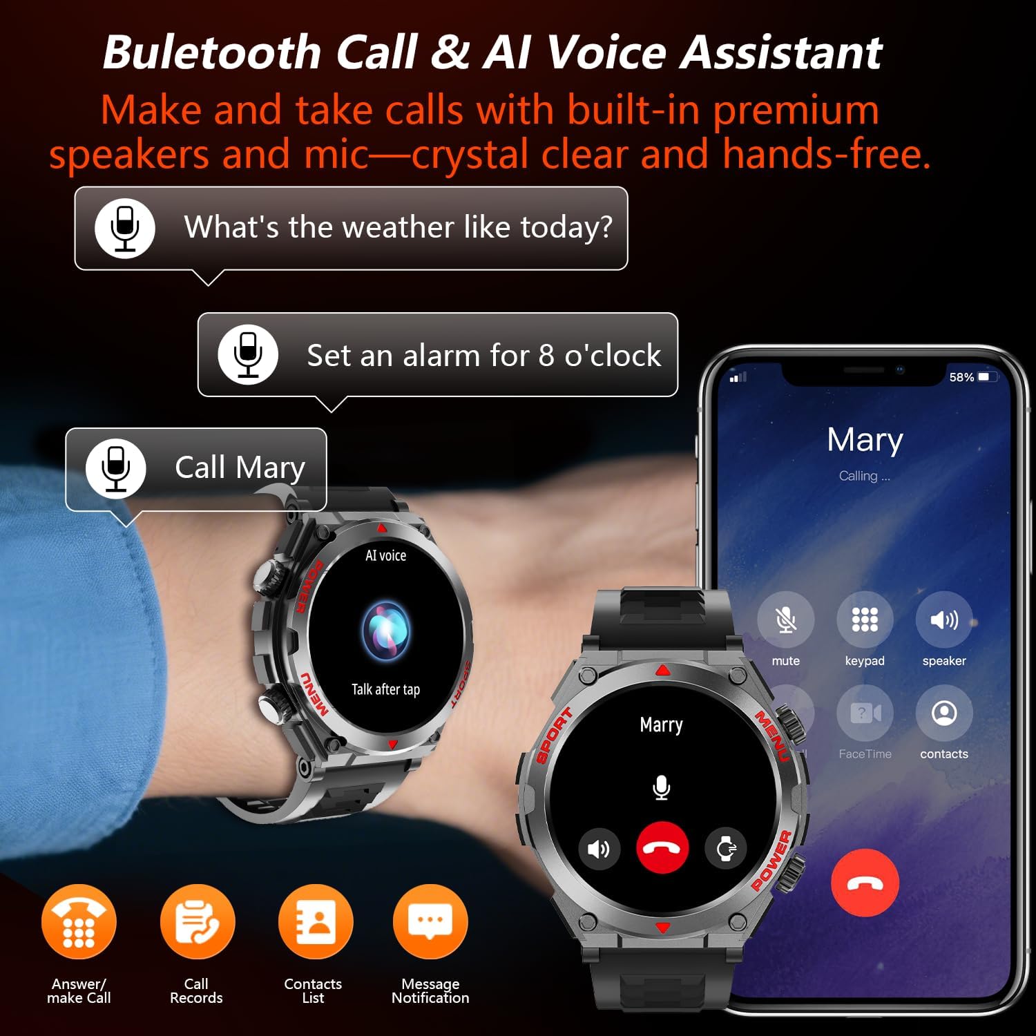 Customizable HD Watch Faces:2025 smart watch upgrade, features a durable 1.52″ HD display with scratch/water/dust-proof composite case. Personalize with 100+ watch faces, photo customization, or AI-generated designs via voice command for unique styling.