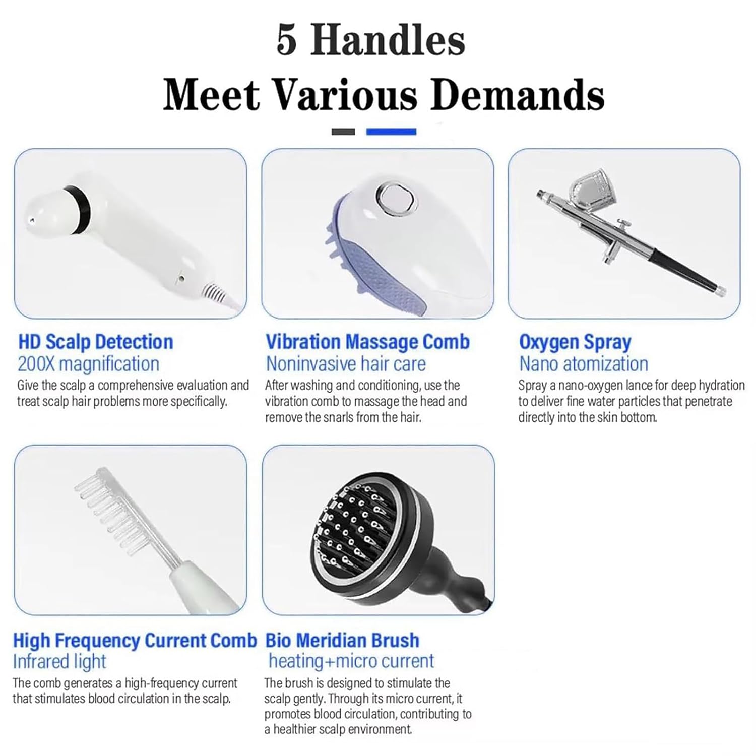 【PERSONALISED PLAN】: Based on the test results, a personalized skin care and scalp care plan is compiled for you and recommended products and care methods suitable for your skin and scalp type. The device has 5 functional handles (high frequency, scalp analyser, massage comb, nano sprayer, meridian brush)