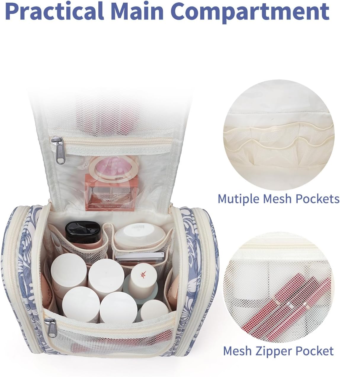 Narwey Small Hanging Toiletry Bag Women Travel Makeup Bag Organizer Toiletries Bag for Travel Size Essentials Accessories Cosmetics (Medium, Blue Leaf)