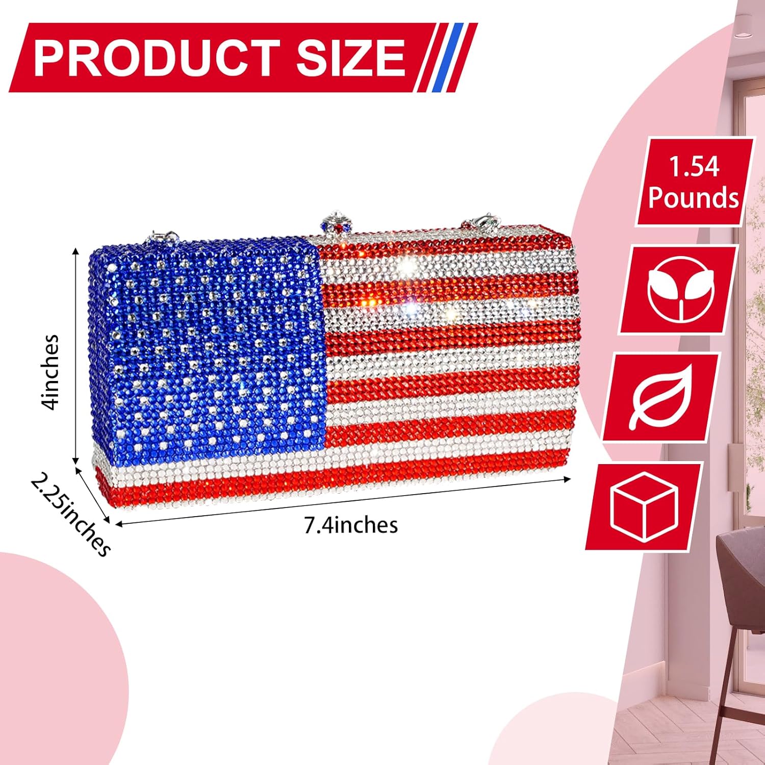 Elevate your style with our National Flag Rhinestone Clutch Purses Handbags. Crafted with meticulous attention to detail, these handbags feature a unique American flag design, adorned with high-quality crystal rhinestones that add a touch of luxury and glamour. The clutch purse design offers convenience and versatility, making it the perfect accessory for formal occasions, evening banquets, and parties. Show your love and respect for the United States with this fashionable and eye-catching handbag.