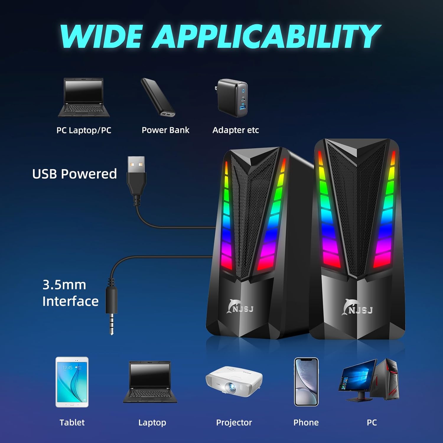 Multi-device Compatibility: This computer speaker is USB-powered (5V) and connect your device via the 3.5mm input.It can work great with any device that has a standard 3.5mm headphone jack.such as PC s,laptops, desktop, tablet, mobile phone,Ps4 ,Ps5 Xbox One.