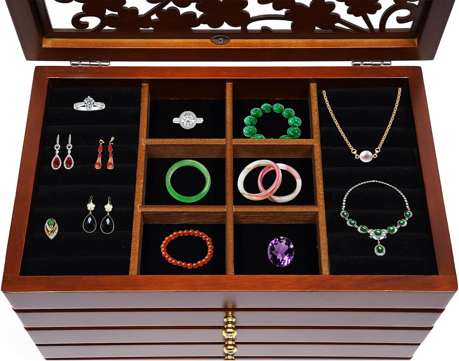 ☀6-tier structure, including the top jewelry tray and 5 drawers, allows for maximum storage space, creating multiple compartments to organize all types of jewelry.