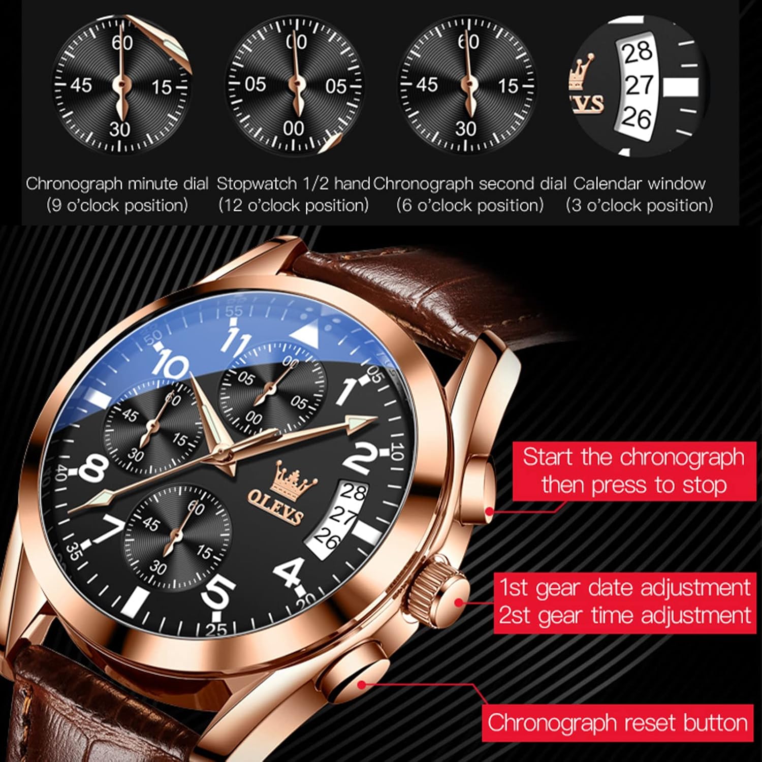 Be the first to review “OLEVS Men’s Chronograph Quartz Watches, Leather Strap Gold Case with Day Date, Waterproof Stainless Steel Wrist Watch, Luminous Hand Analog Watches for Men, Brown/Black/Blue/White Dial”