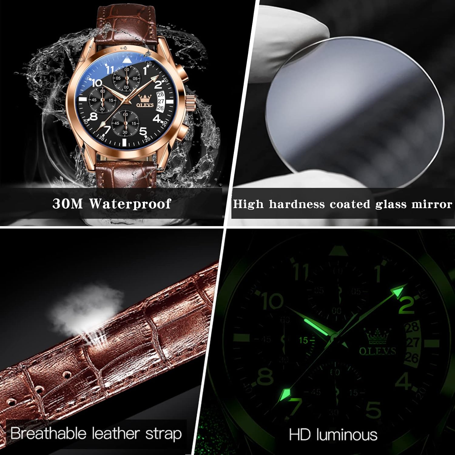 OLEVS Men’s Chronograph Quartz Watches, Leather Strap Gold Case with Day Date, Waterproof Stainless Steel Wrist Watch, Luminous Hand Analog Watches for Men, Brown/Black/Blue/White Dial