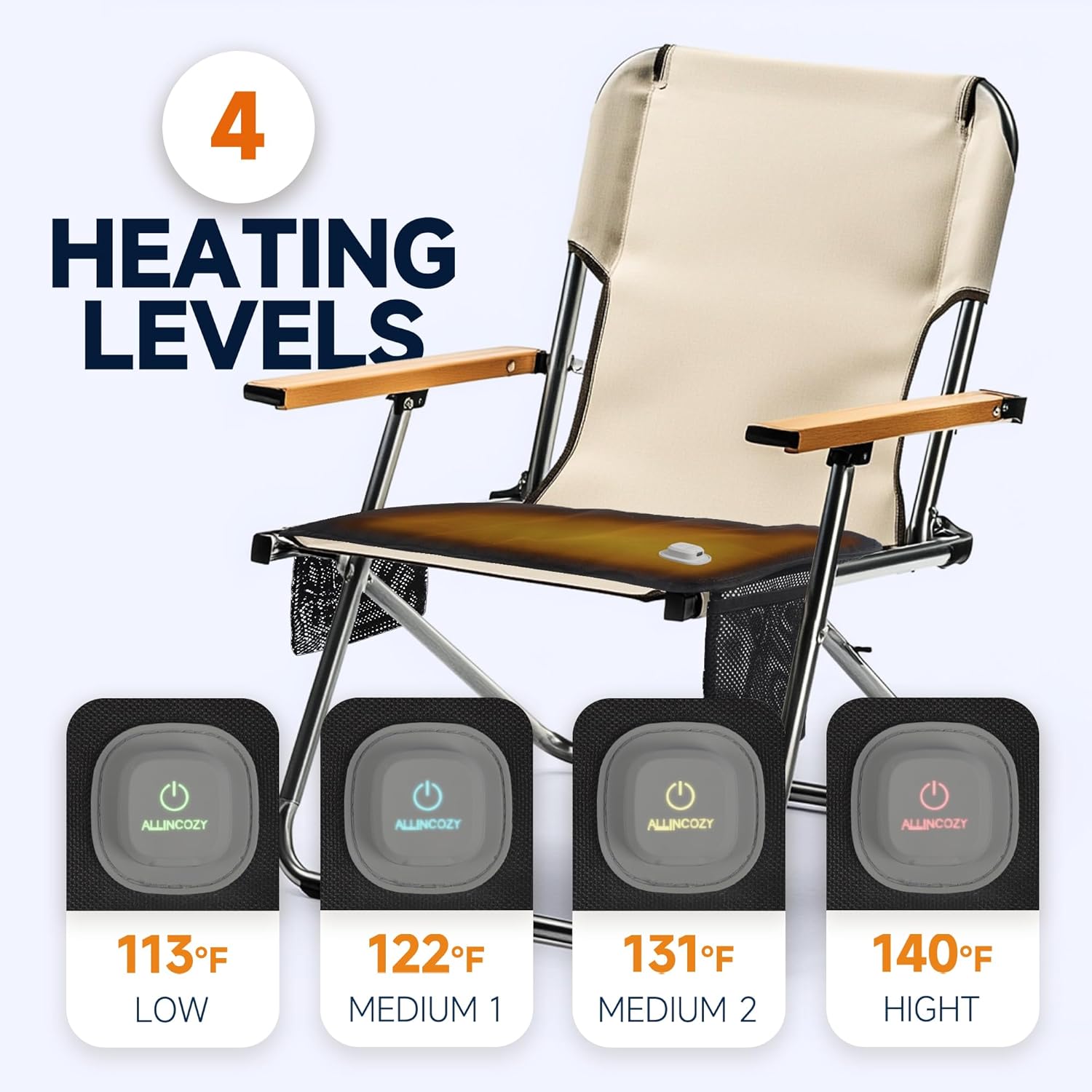 Graphene Heating Technology: Provides fast, even heating with 4 adjustable levels, perfect for bleacher seats, stadiums, and hunting chairs.