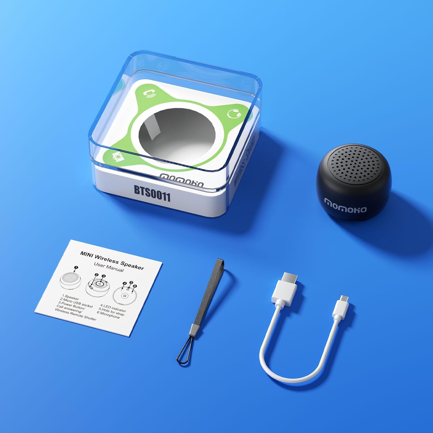 Thanks for Choosing MOMOHO mini bluetooth speaker. You will get 1 x small speaker Bluetooth, 1 x charging cable, 1 x Lanyard, 1 x user manual,The small speakers are the best keychain speaker Christmas gifts/mini gifts/small gifts/gifts under $20