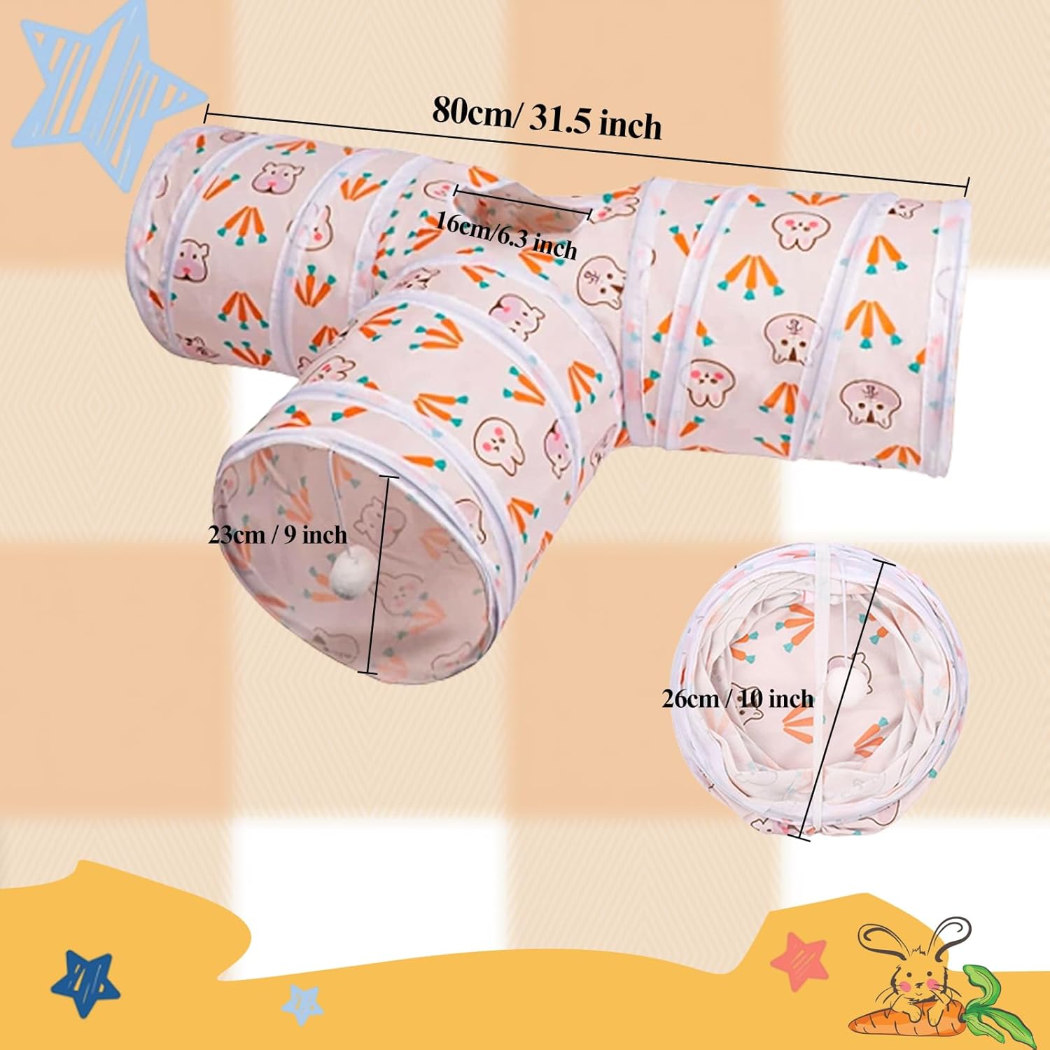 【3 Ways Design】Bunny tunnel with 3 spacious tunnels, peephole & hanging ball toy, this rabbit toy gives your bunny more ways to have fun,the carrot pattern will attracts your small pet to play,keeping your rabbit entertained for long hours.