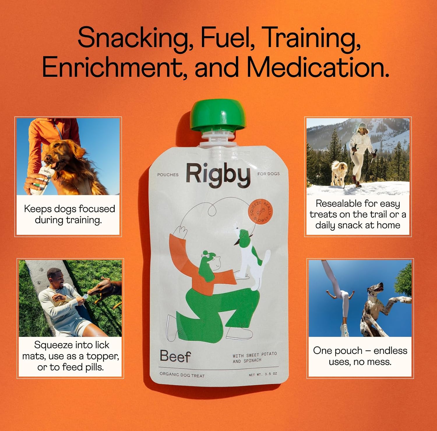 HEALTHIER, MORE VERSATILE DOG TREAT – Rigby is the first squeeze pouch for dogs — made with just 4 simple organic ingredients. Human-grade, low-calorie, and free from fillers, binders, and preservatives. One pouch that works for training, enrichment, meal topping, wellness, and pill time.