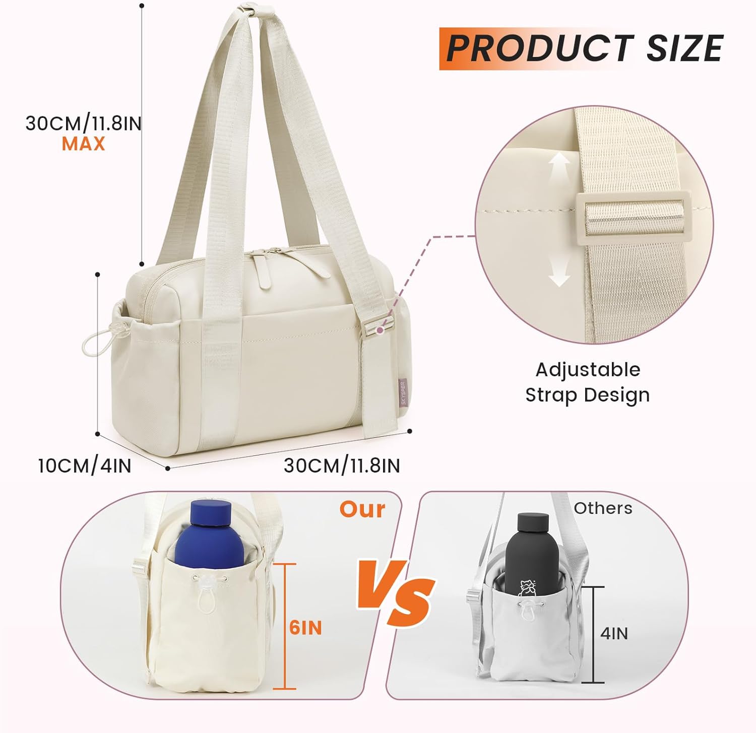 Deepened Side Pockets + Tightening Straps to Lock Items:Securely holds 16oz water bottles with adjustable straps – prevents spills in your small gym duffle bag during intense workouts or commutes.
