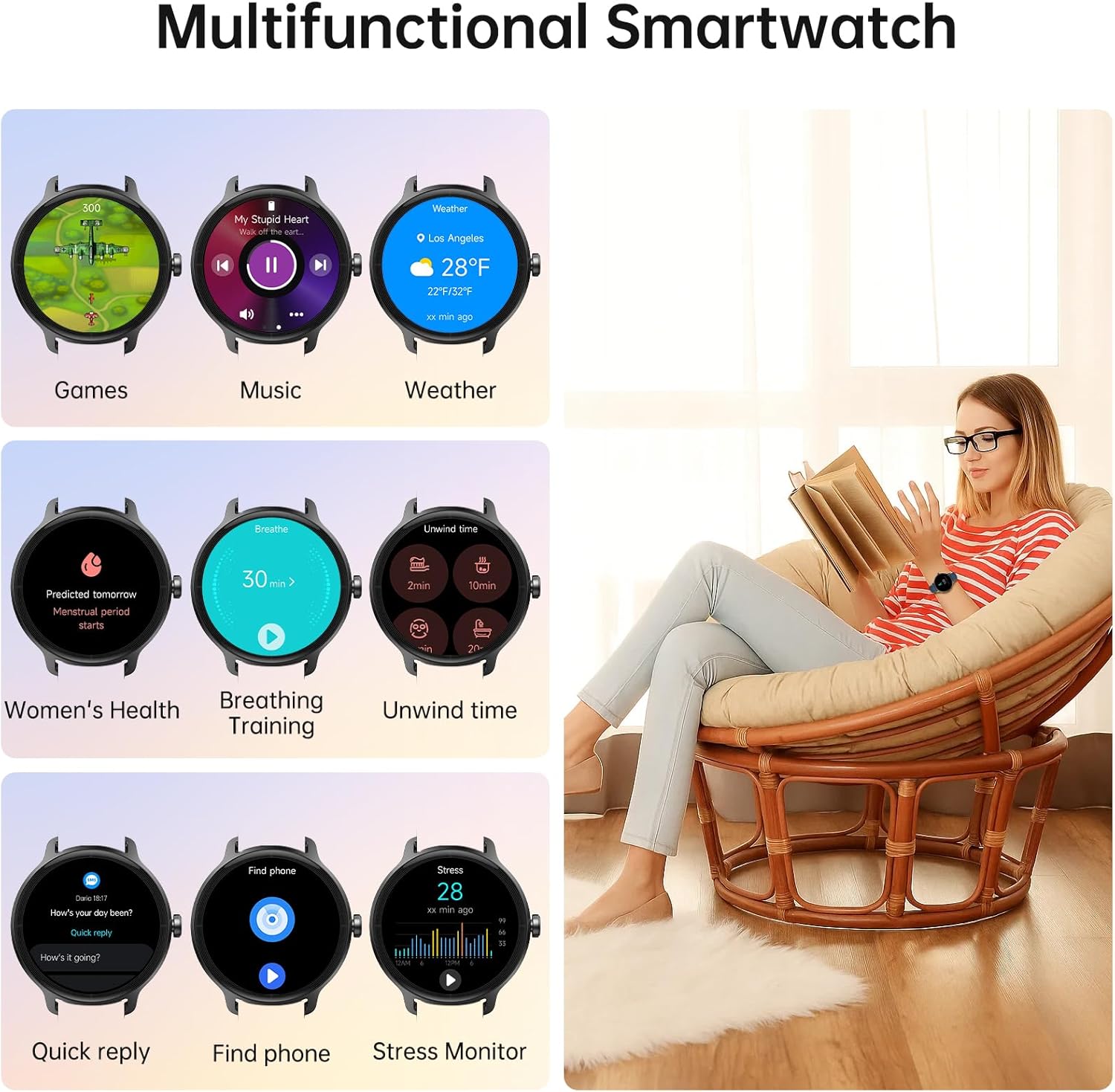 Smart Watch with Bluetooth Call & AI Voice Assistant: Experience seamless connectivity with this smart watches for men women. The 1.27″ HD circular display enables direct Bluetooth 5.3 calls: answer/make calls, store 20 frequent contacts, review call history. Activate built-in AI voice (“Hey Siri”/”Hey Google”) to make calls, control music playback, or check real-time weather hands-free. Elevate efficiency during workouts/commutes with instant voice commands.