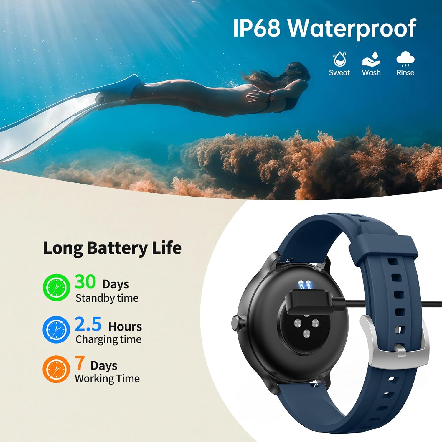 Waterproof Watch with IP68 & 7-Day Long Battery: DR03 Smart watch is IP68 rated waterproof, so you can wear it while washing your hands, face or daily sweating without worrying about water intrusion. (Do not use for baths, saunas, hot springs, etc.) Crafted with a 290mAh battery delivers 7 days of active use or 30 days standby. Multitask effortlessly: control phone music, set calculator, use alarms, and enjoy all-day health guard.