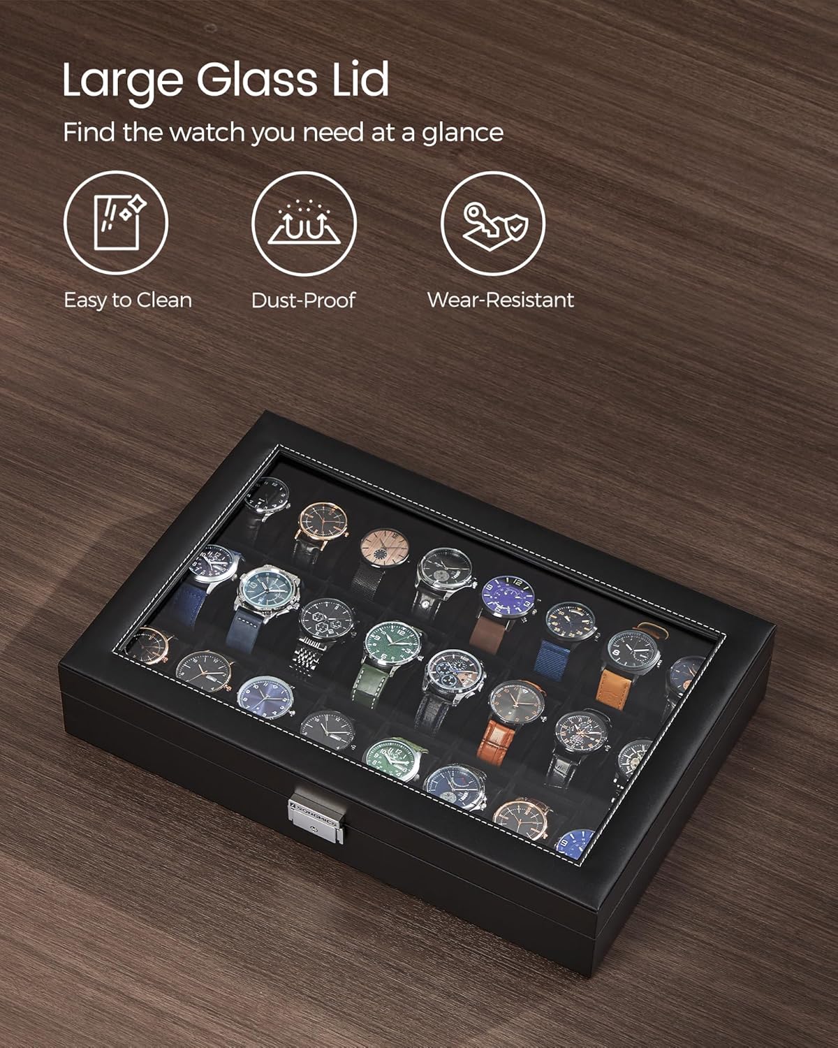 [Clear Glass Lid] The large see-through glass lid of this watch case allows you to see and find the right watch at a glance. Plus, it’s durable and easy to clean