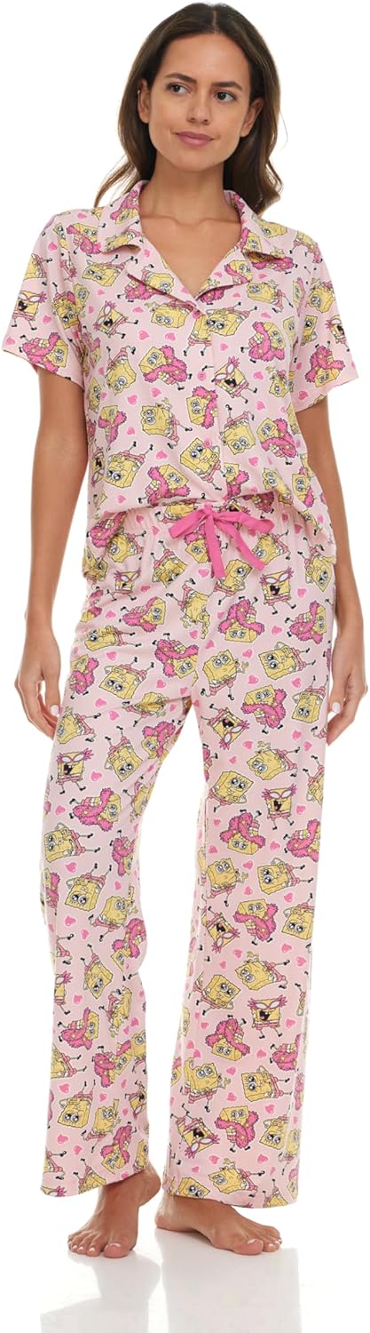 Spongebob Women’s Pajama Set, Soft Stretchy Pajamas with Pants and Short Sleeve, Notch Collar & Button Down Top