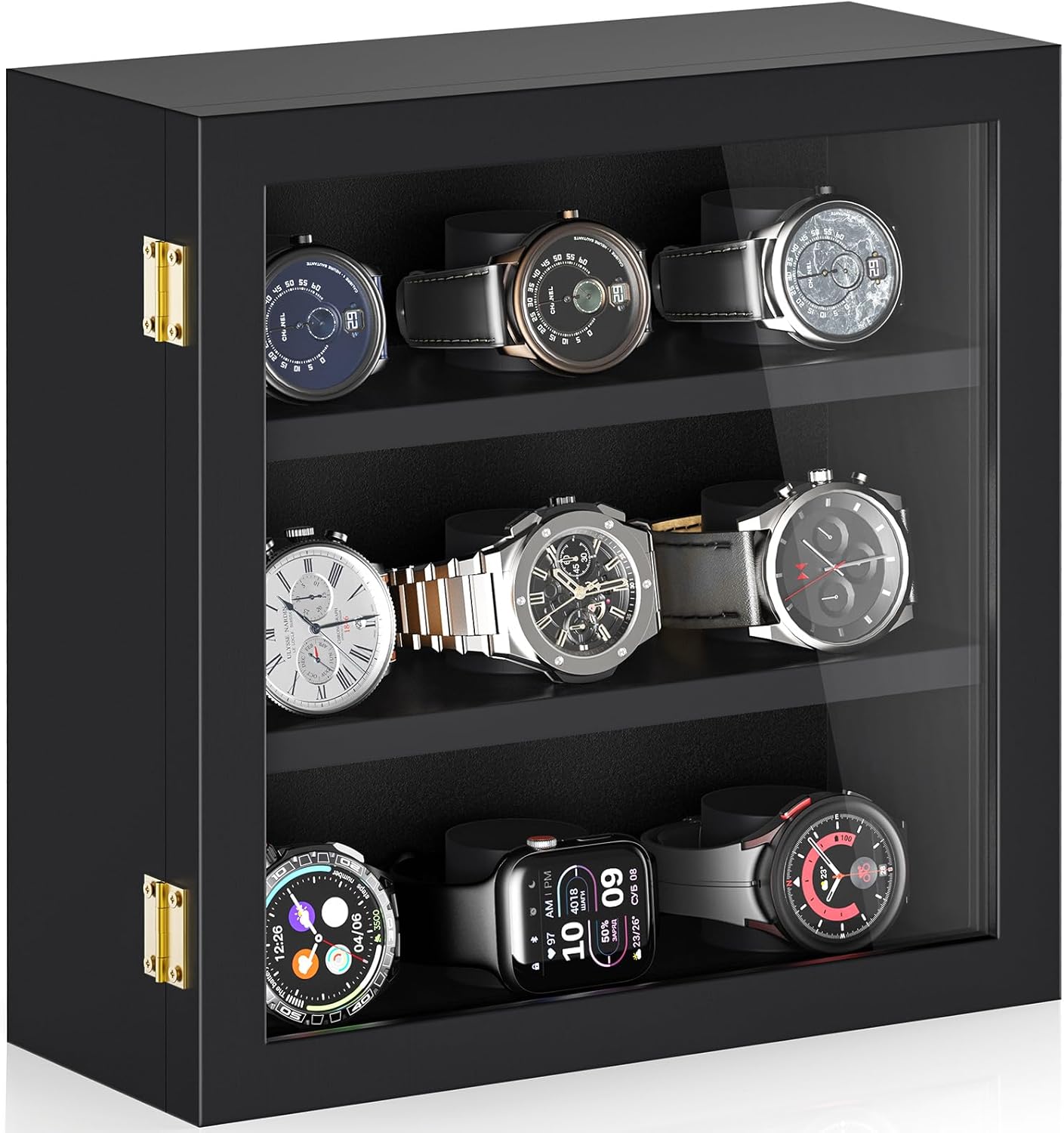 3 layers of wood panel design, you can put 9 pairs of watches. This watch storage box is great if you want to be able see your watches but still want to keep them protected from dust.