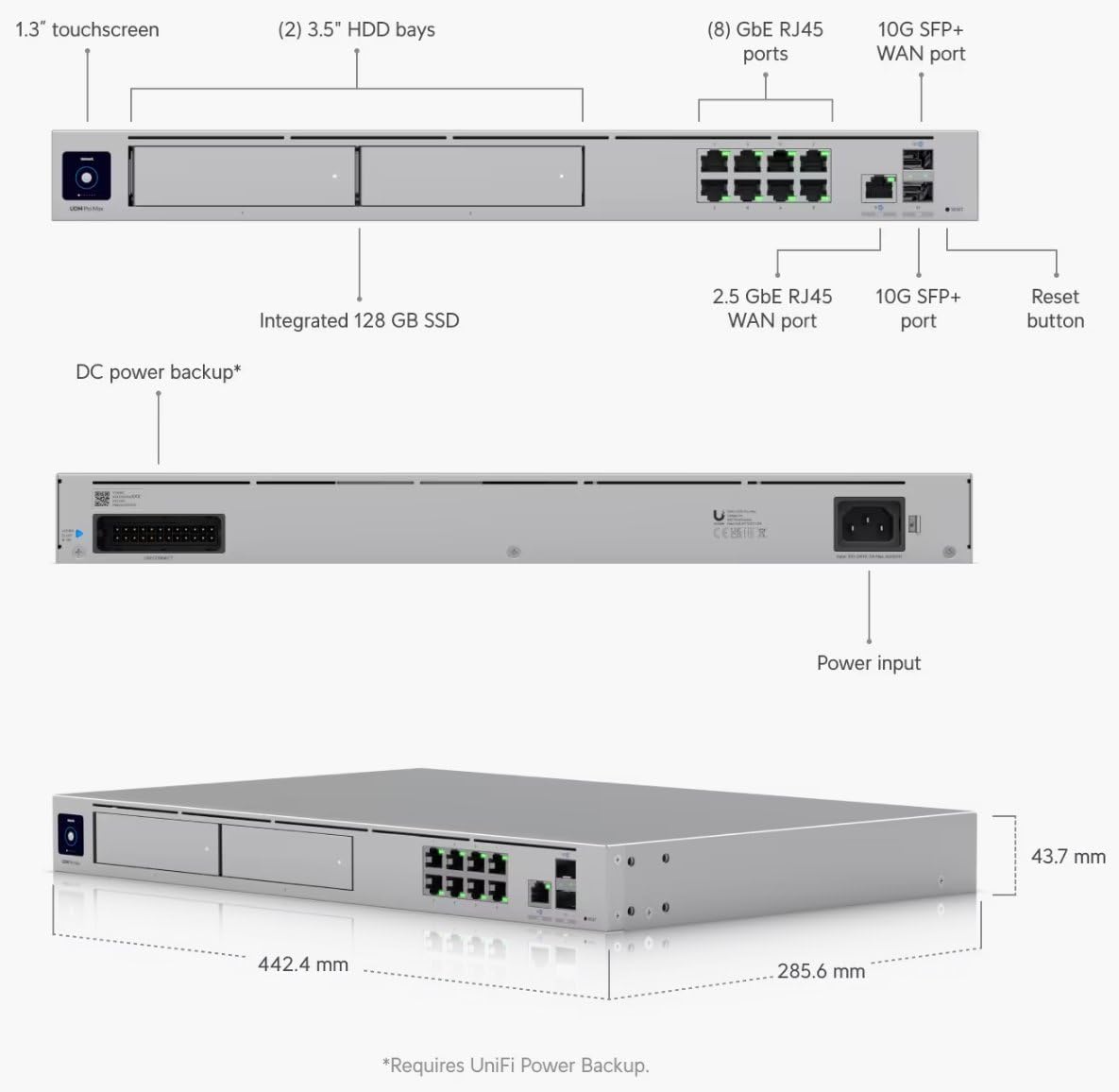 Enhanced computing power and memory for 2x the UniFi device and client capacity of Dream Machine Pro/SE,Includes full UniFi application suite for device management,5 Gbps routing with IDS/IPS,(1) 10G SFP+, (8) GbE RJ45 LAN ports,(1) 10G SFP+, (1) 2.5 GbE RJ45 WAN ports,(2) 3.5″ NVR HDD bays with RAID data protection,Built-in 128 GB SSD for NVR detection recordings,UniFi Power Backup ready,1.3″ touchscreen