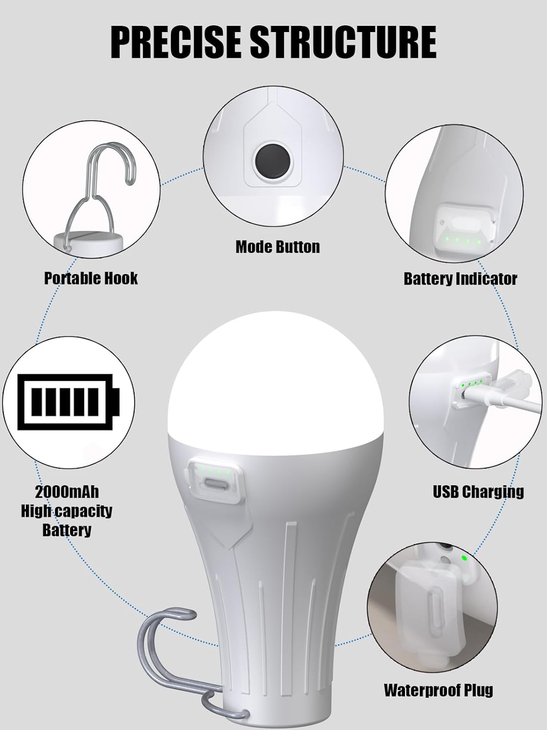 USB Rechargeable Camping Light Bulbs, Waterproof LED Tent Lights for Camping, 2 Pack Rechargeable Light Bulbs with 4 Light Modes for Camping, Hiking, Emergency, Indoor & Outdoor Use