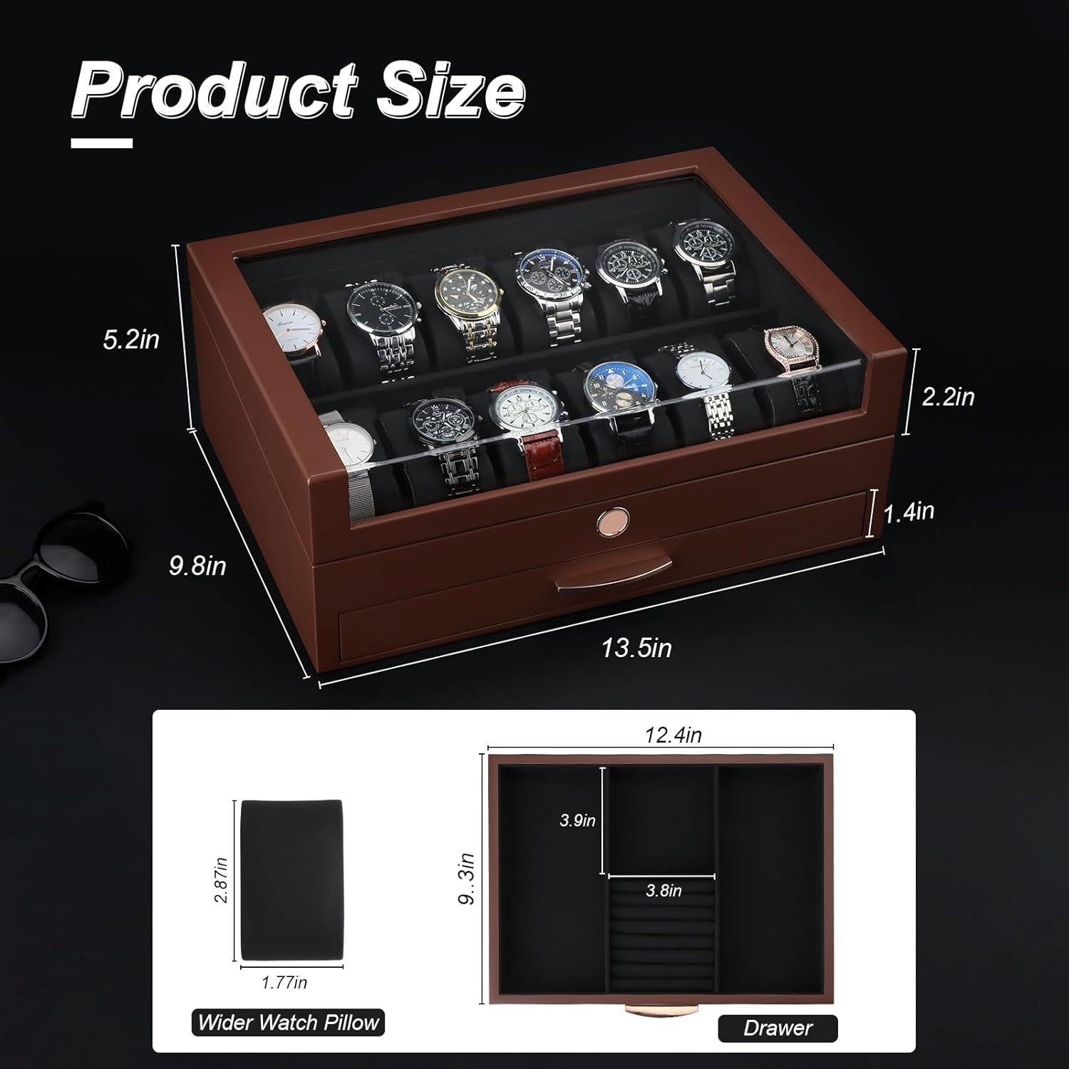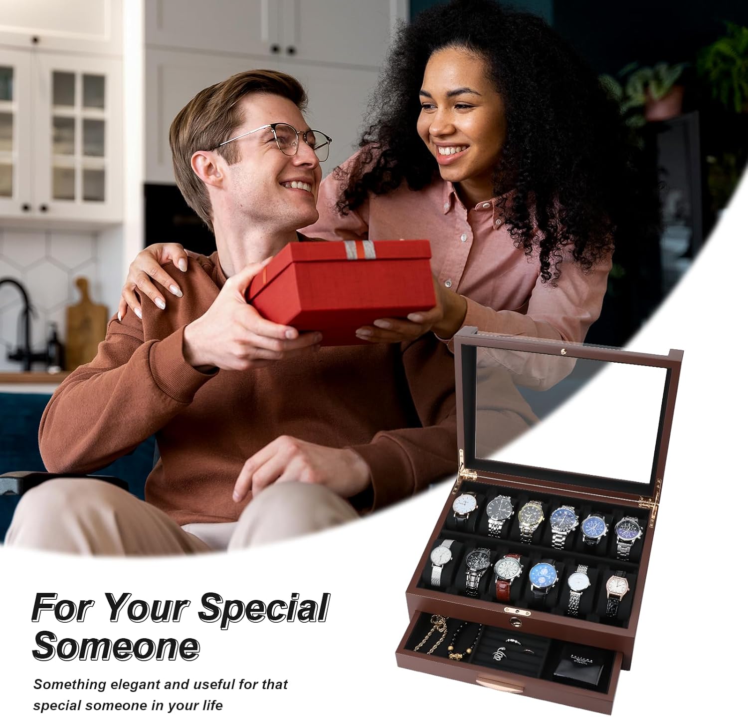Watch Box, Watch Case for Men and Women with Large Glass Lid, Wooden Watch Display Storage Box with 12 Slots