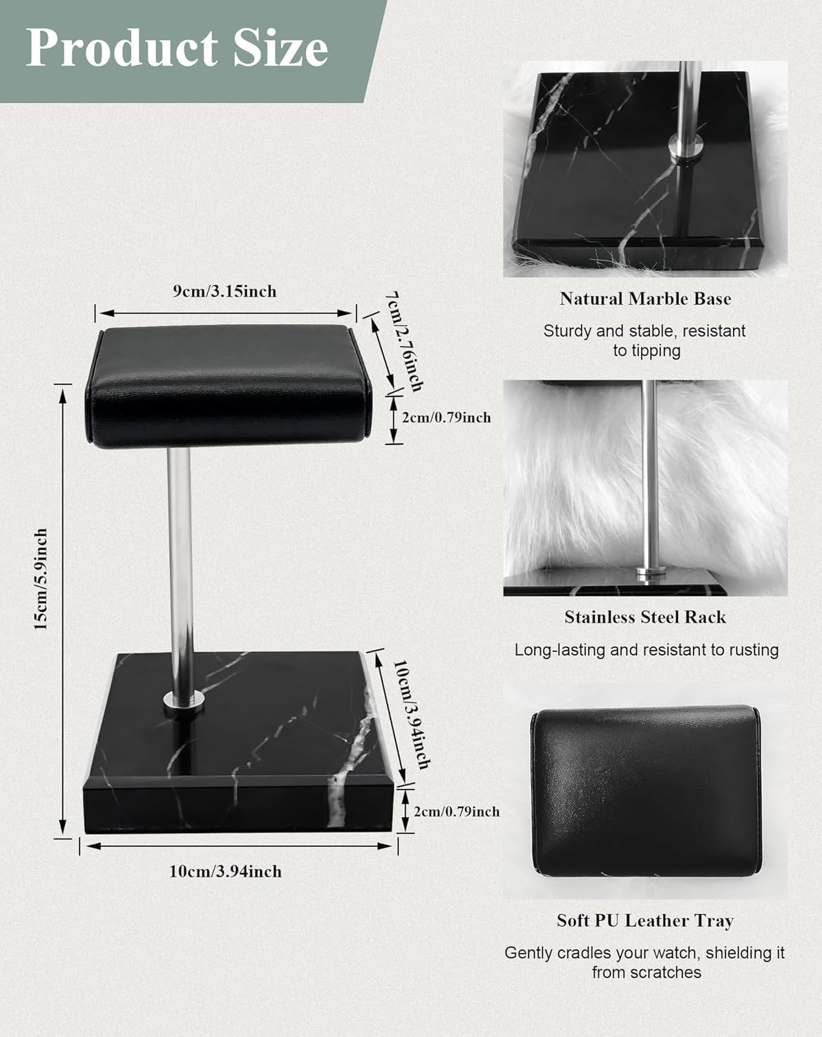 【 Well-Built】- Featuring a sturdy base and cushioned pillows, our well-built watch stand securely holds various timepieces without scratching, thanks to its leather and high-quality sponge lining.