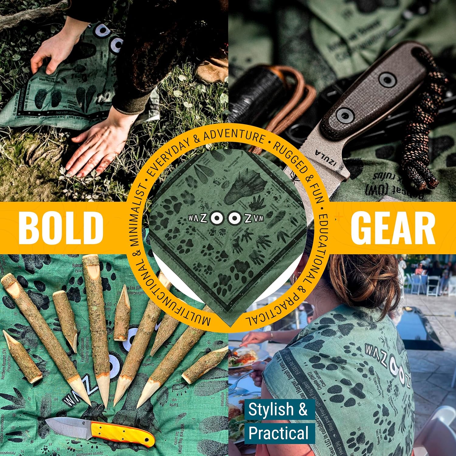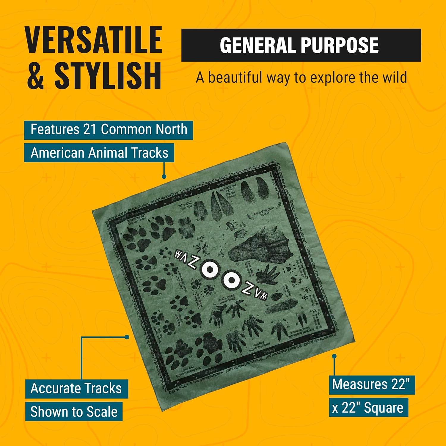 Wazoo Survival Bandana – Featuring 21 Animal Tracks, Made In USA with 100% Cotton Hiking Bandana for Camping, Hunting, Backpacking & Outdoors, Educational & Practical Scarf, Handkerchief & Face Mask