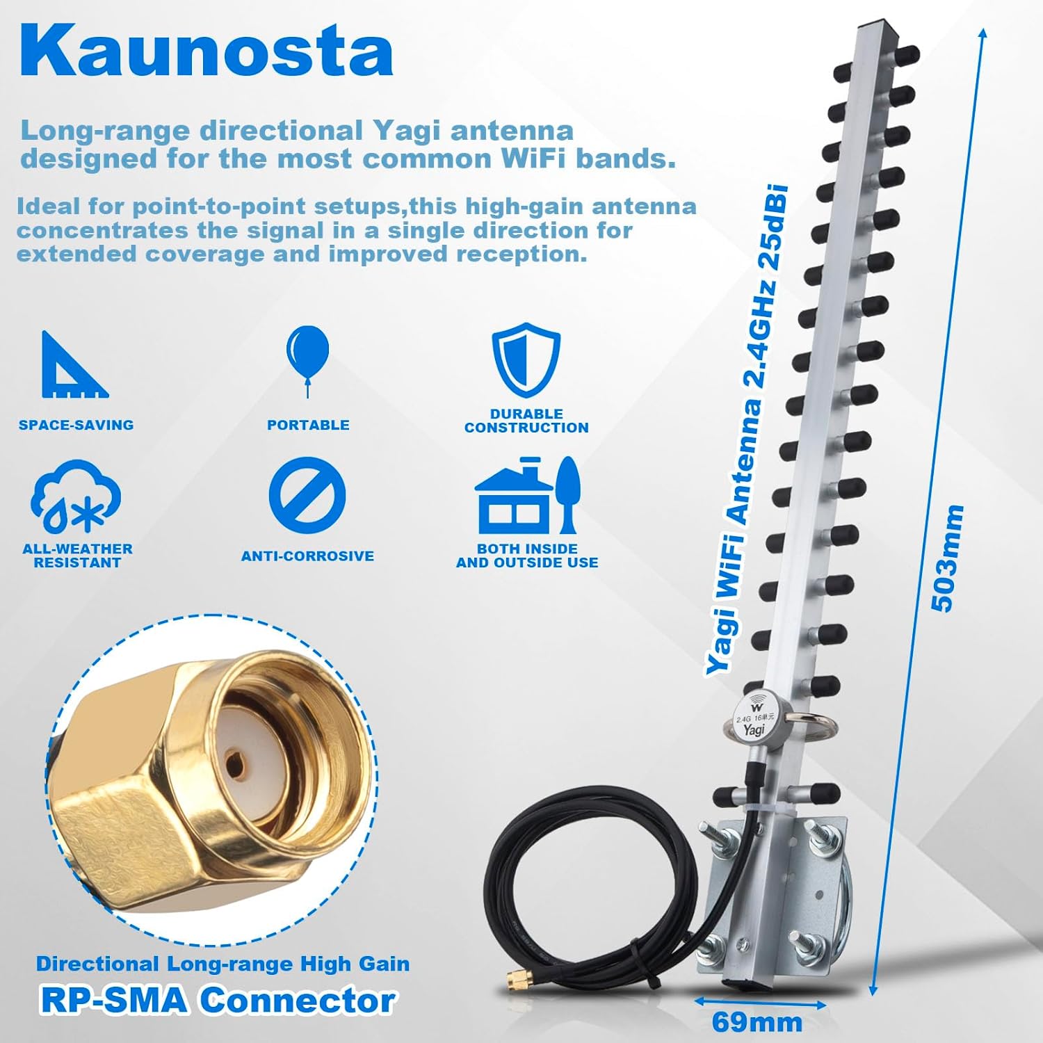 Wireless Yagi is ideally suited for directional and multipoint 2.4 MHz band applications.Ideal for long-range outdoor setups—bridge WiFi from your house to a gate, barn, or shed over 300 meters away.WiFi Yagi antenna is the most popular type of directional antenna in use today. The 25dBi 2.4Ghz Outdoor Yagi Antenna offers 25° Vertical Beamwidth, providing strong directional gain for long-distance point-to-point setups. It is approximately 51cm (20 inches) long and comes with an RP-SMA Male connector and a 1.5M cable for flexible installation. RP-SMA is a widely-used industry standard connector with a threaded outer shell and a center pin.The Yagi antenna operates without the need for grounding in most cases. However, you can ground the antenna via the outer conductor of the connector and the cable, or through the mounting hardware. We do, however, recommend you install a lightning surge protector between the Yagi and your device to prevent a lightning strike from damaging your equipment.Kaunosta Yagi WiFi Antenna is designed for easy integration and maximum signal performance. Unlike many other Yagi antennas, this model comes with a built-in RP-SMA Male connector and a 1.5M coaxial cable, which means in most cases, you can connect it directly to your WiFi router, access point, or wireless card—no extra adapters or converter cables needed. This makes installation faster, cheaper, and way more hassle-free. Of course, if your device uses a different connector, you can still use a compatible adapter if necessary.You can also place an amplifier or signal booster between the device and antenna if needed for extreme long-range performance.Field-tested for long-distance signal bridging—ideal for gate-to-home setups up to 300 meters (1000 ft) with clear line of sight.The Yagi antenna is used to direct the WiFi beam. It will increase the signal/reception in the direction it is pointing, making it ideal for point-to-point or long-distance wireless applications.The antenna does not come with a mast pole mount; it includes two U-bolts which can be used with the attached plate for secure pole mounting. It allows for vertical polarization depending on your mounting orientation.
