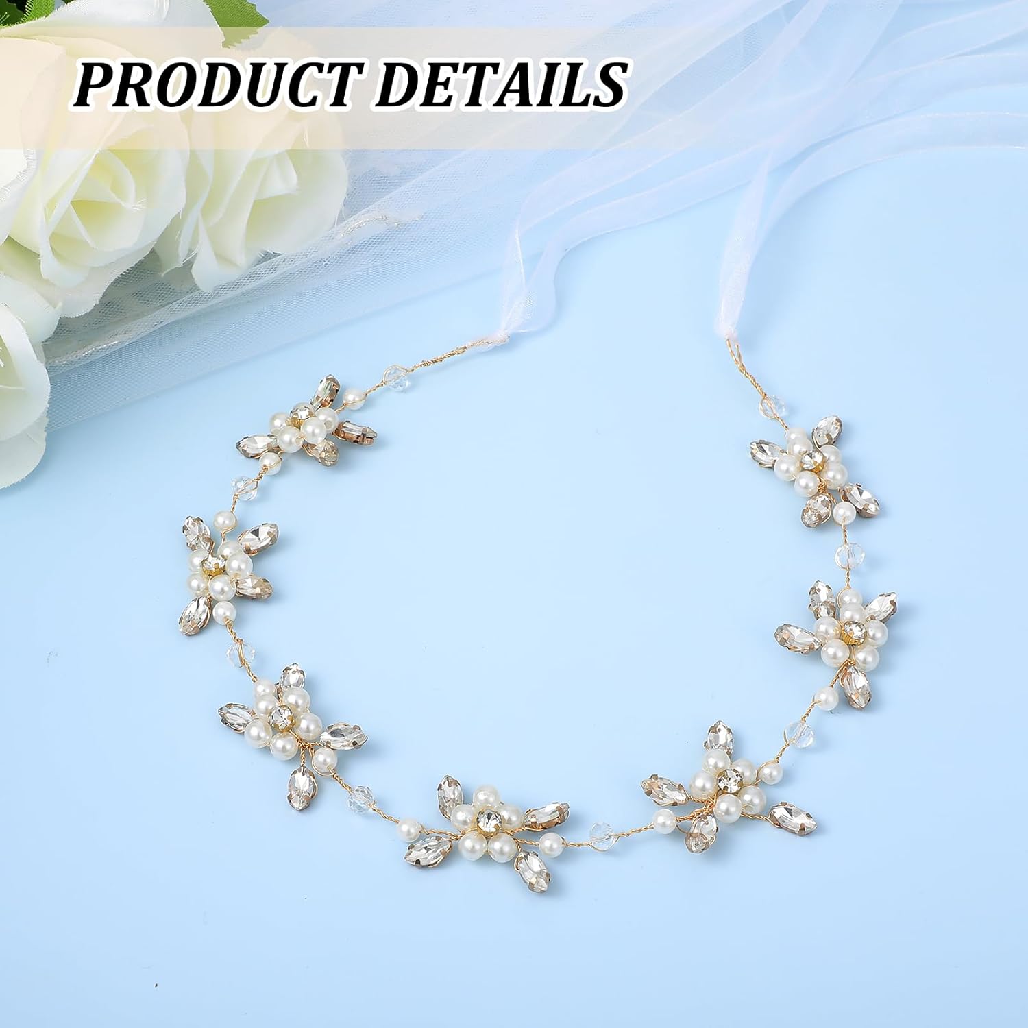 High-Quality Materials: This flower crown for girls is made of multiple materials. Copper wire is used to fix the semicircular shape, rhinestones are used as leaf shapes, imitation pearls are used as flower shapes, and the silky streamers are made of polyester, which is not only durable but also comfortable to wear