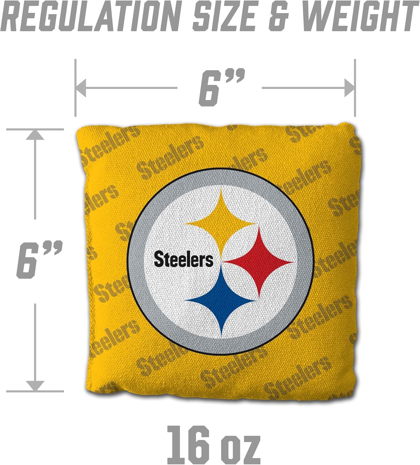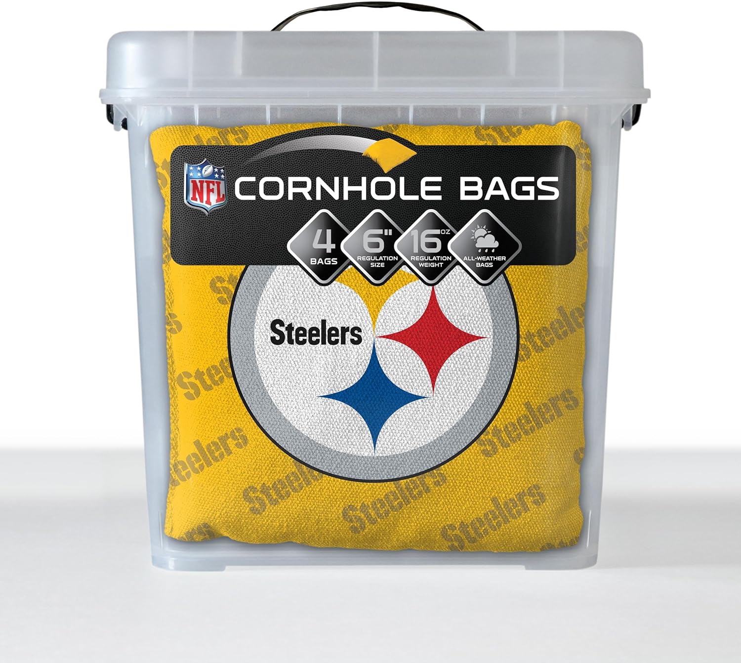 Durable, team-colored fabric bags filled with resin beads; Regulation size, 6” x 6”, 16 oz bags made of 80% polyester and 20% cotton