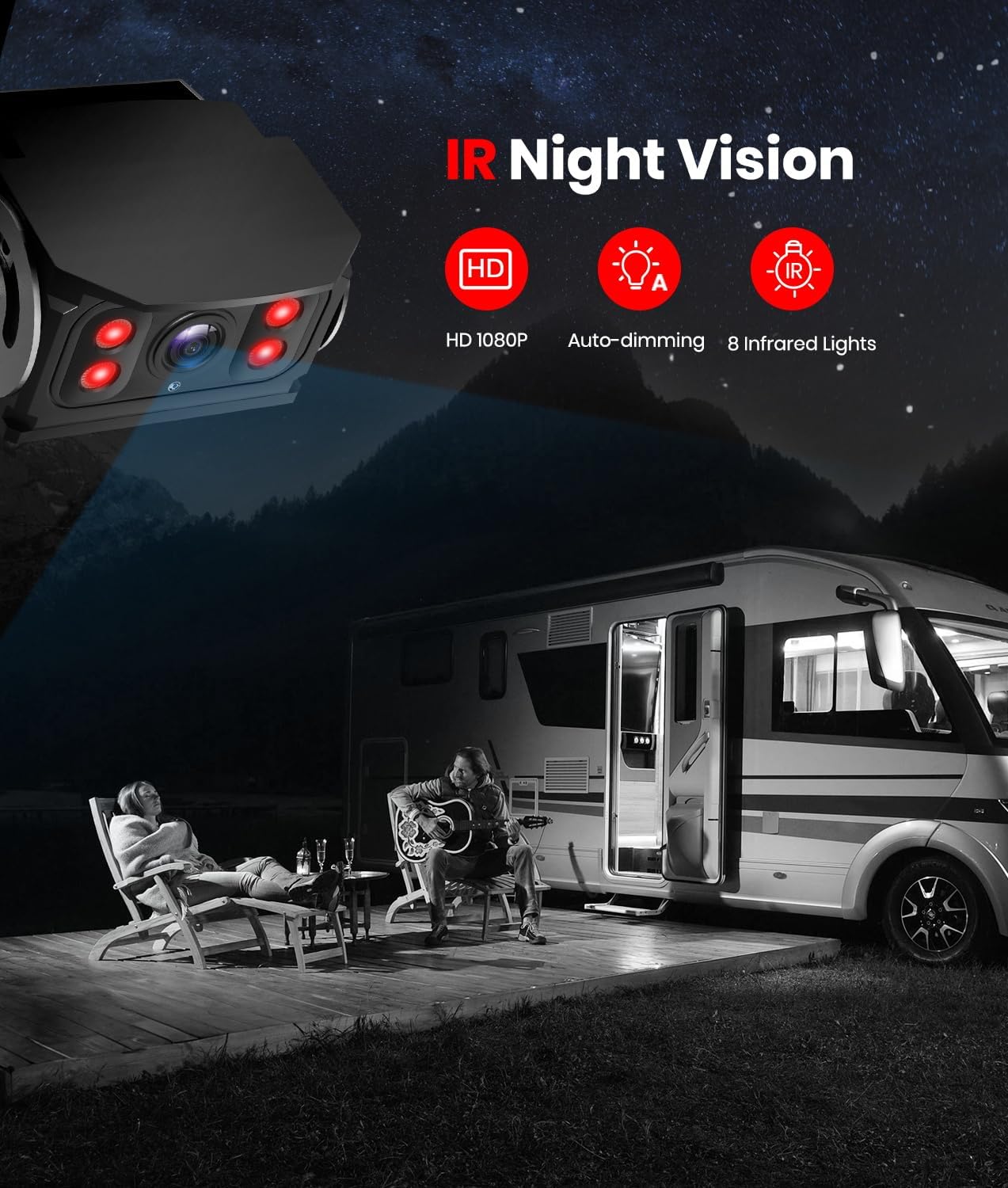 Enhanced 1080P & Night Vision: The 1080P HD rv camera with infrared night vision and equipped with CMOS image sensor, automatically adjusts brightness, reduces glare, and obtains unparalleled visibility and clear images, helping you control road conditions day or night. Perfect for pickup trucks,horse trailers,SUVs,vans,etc