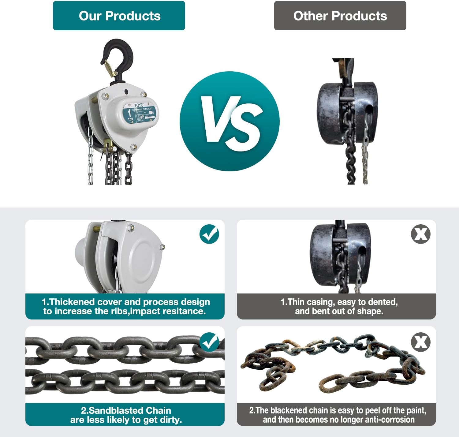 【Excellent TOYO Product Design】– Chain fall uesd Multi-point support structure,the transmission system is balanced,flexible operation and low failure rate.high safety performance.