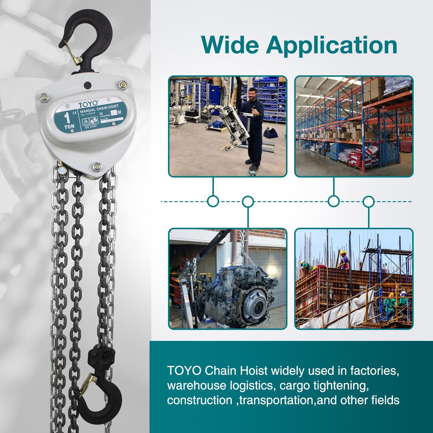 【Wide Application】– TOYO chain block widely used in industrial areas, including factories, warehouses, farms, garages, ship-building, transport, construction sites, workshops, and mines