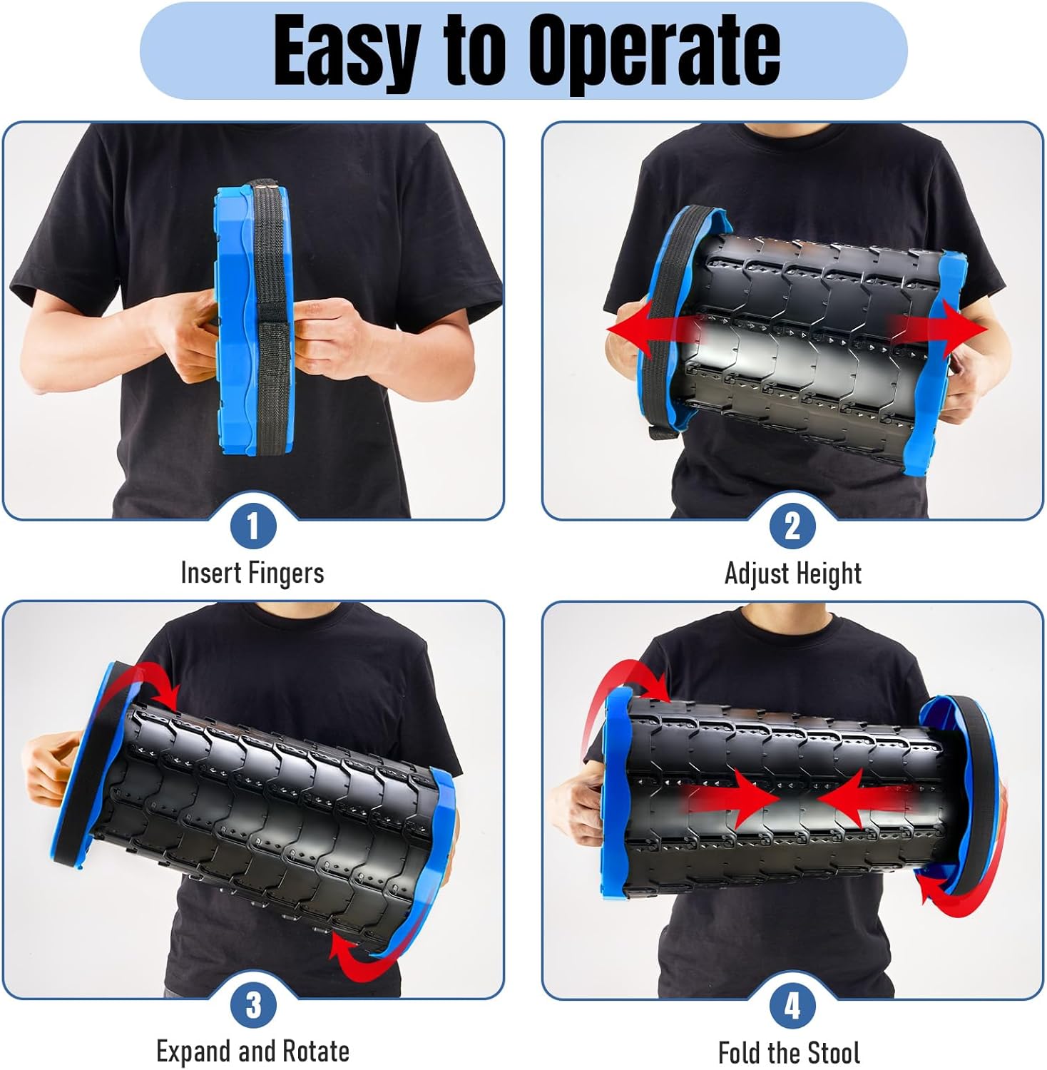 【Easy To Open And Use】The interior of this portable collapsible chair is designed with stiffeners to hold it in place, making the folding stool stronger and easier to open and close. The top and bottom of the collapsible stool are designed with two holes, you just need to hold the two holes, stretch and turn them clockwise/counterclockwise, and you can easily open and close the portable chairs for adults.