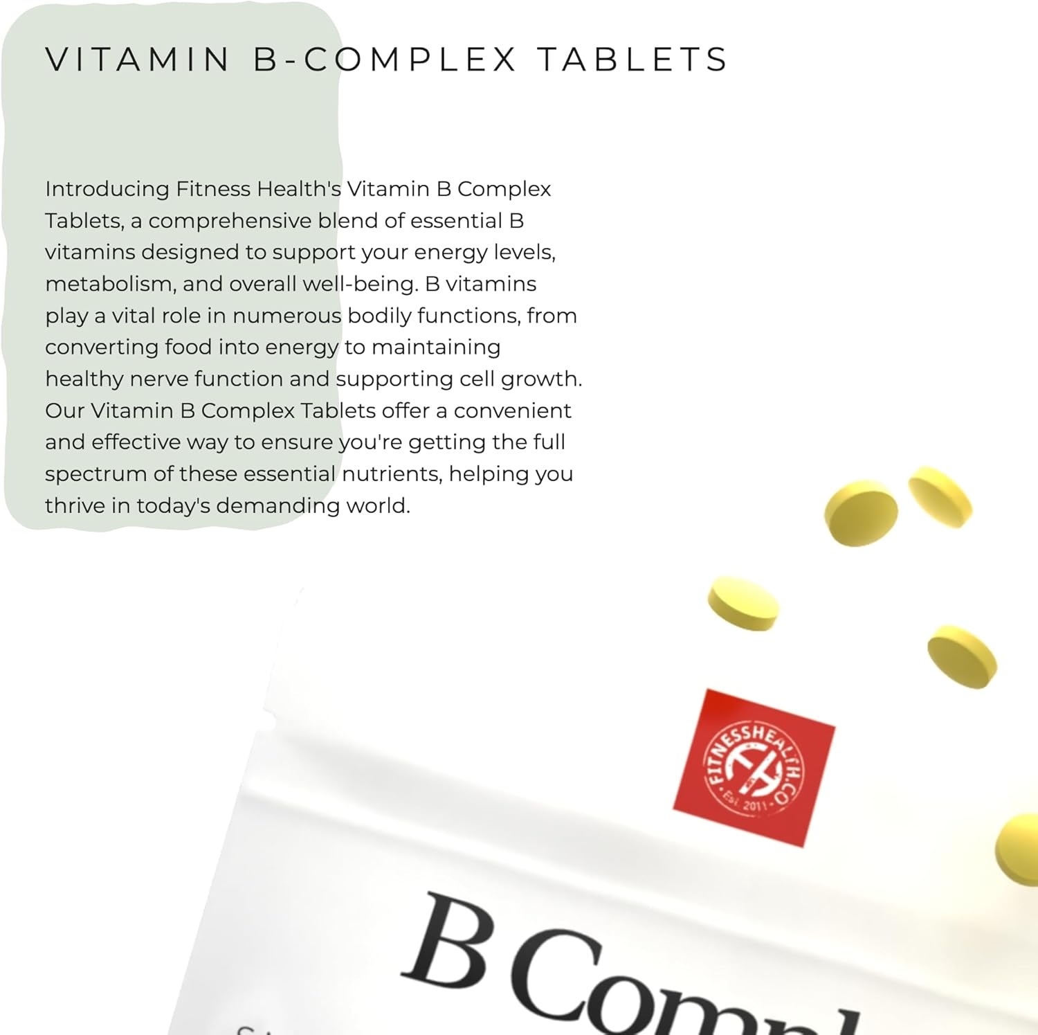 B vitamins are vital nutrients required by the body. They help our bodies convert food into energy, allowing us to stay energized throughout the day, as well as supporting our mental performance. B vitamins are important for making sure the body’s cells are functioning properly. They help the body convert food into energy. Our Vitamin B Complex is suitable for both vegetarians and vegans and is GMO-free and FREE from milk, lactose, gluten, and wheat.INGREDIENTS: Fitness Health Vitamin B Complex Tablets contain vitamin b3 16mg, vitamin b5 6.6mg, vitamin b5 6mg, vitamin b6 1.7mg providing vitamin, b6 1.4mg, vitamin b1 1.4mg providing vitamin b1 1.1mg, vitamin b2 1.4mg, vitamin b12 1% 0.25mg providing 2.5mg, folic acid 200mg biotin (d-) pure 50mg microcrystalline cellulose, magnesium stearate.SUGGESTED USE:Take one tablet per day with water. Do not exceed the stated dose.CAUTION:This product is a food supplement and therefore should not be used as a substitute for a varied diet and a healthy lifestyle. Store in a cool dry place. Out of the reach of young children.