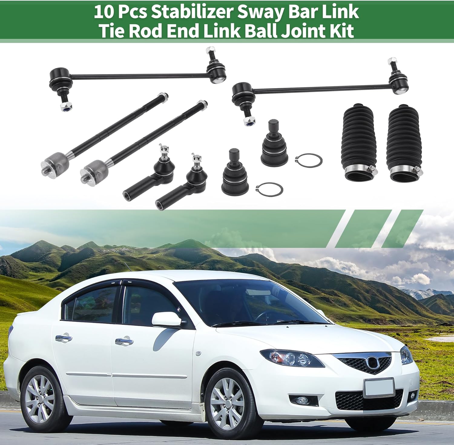 The Tie Rod Ends is built to withstand the tough driving conditions.The durable Sway Bar Link is rust and corrosion-resistant.The car’s handling ability decreases, you may need to replace the Ball Joint.Made of durable material and solid strength structure, which is wear-resistant and corrosion-resistant, making it more stable during operationPlease make sure that the suspension parts are suitable for your vehicle before ordering.This is a non-OEM product, accessory only!